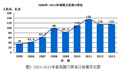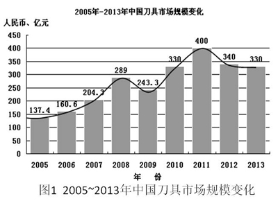 从图1可以看出,我国工具市场规模2011年达到了400亿元人民币的高点,接着由于经济过热、通胀高企,国家实施宏观调控,经济增长率一路下行,工具市场的规模也出现了连续两年的收缩。到2013年末,降至330亿元人民币,和2011年的高点相比,降幅达到17.5%。