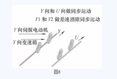 图4、图5和图6分别是工作台固定式与横梁移动式龙门机床的传动示意图,图中可以看出工作台移动式龙门的工作台传动由于工作台比较重,必须采用伺服电动机加行星减速箱减速才能提供足够的驱动力,但即使是精度最高的行星减速箱也仍然有间隙,当然这个间隙一般人认为是可以通过系统补偿掉,这个想法在工作台不重或移动速度不快,总之没有大的冲击力时是可以的,但对于龙门机床一般承载都较大,且工作台本身就比较重了, 一旦在高速反向时由于这个大的惯量,自然把这个间隙带出来,这就是过切产生的原因,因此只有降低速度和加速度来减少过切的程度。