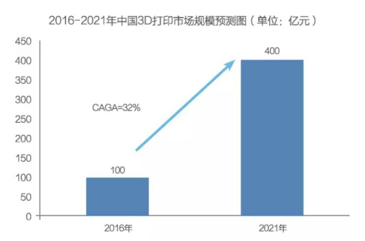 2012年,中国3D打印市场规模为10亿元,2014年市场规模达到50亿元,《国家增材制造发展推进计划(2014-2020年)》重点提出至2017年要培育5至10家年产值超过5亿元、具有较强研发和应用能力的3D企业,并支持3D打印企业境内外上市。初步预计,2016年我国3D打印市场规模可达到100亿元,2021年达到400亿元左右,年复合增长率约为32%。