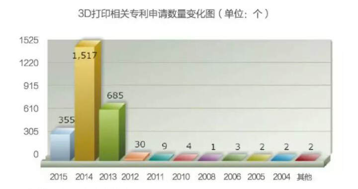 从图中可以看出,我国3D打印技术申请数量主要集中在2014年,占2005-2013年申请数量的59%。专利公开数量同样主要集中在2014-2015年,占全部公开数量的93%。