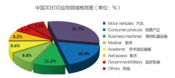 3D打印应用的领域广泛,3D打印在下游应用行业和具体用途领域的分布反映了这一技术具有的优势和特点,同时也反映了这一技术的局限和在发展过程中尚需完善的地方。前瞻分析认为,3D打印机需求量较大的行业包括政府、航天和国防、医疗设备、高科技、教育业以及制造业。目前,应用领域排名前三的是汽车、消费产品和商用机器设备,分别占市场份额的31.7%、18.4%和11.2%。