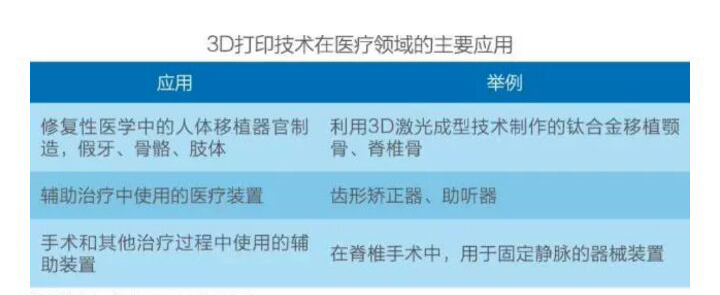 在医疗行业,特别是修复性医学领域,个性化需求十分明显。用于治疗个体的产品,基本上都是定制化的,不存在标准的量化生产。而3D打印技术的引入,降低了定制化生产的成本。因此,近些年来,这一技术在医疗领域的使用比例持续上升。3D打印技术在医疗领域的主要应用如下: