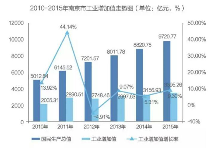 2015年,南京市经济平稳增长。全年实现地区生产总值9720.77亿元,按可比价格计算,比上年增长9.3%。从全年经济走势看,各季度累计增速保持在9.1%- 9.3%运行区间,增幅波动范围稳定在0.2个百分点以内。