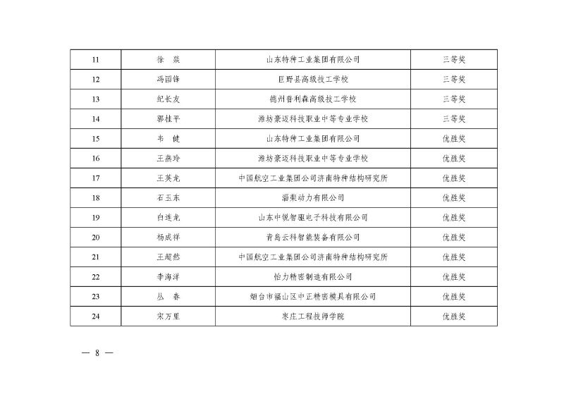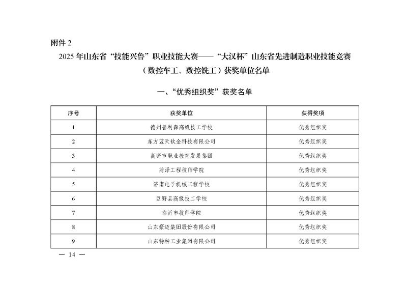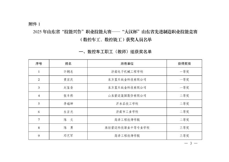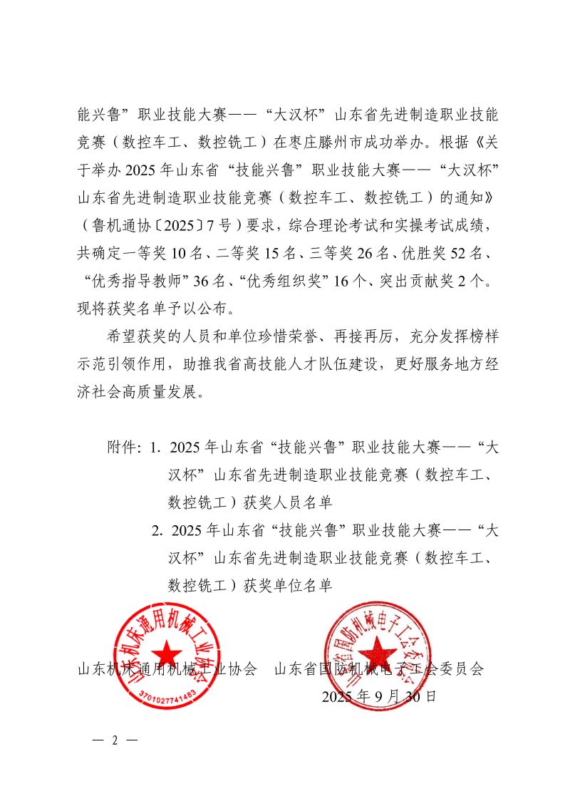 山东机床通用机械工业协会 山东省国防机械电子工会委员会 关于公布2025 年山东省“技能兴鲁”职业技能大赛 ——“大汉杯”山东省先进制造职业技能竞赛 (数控车工、数控铣工)获奖名单的通知