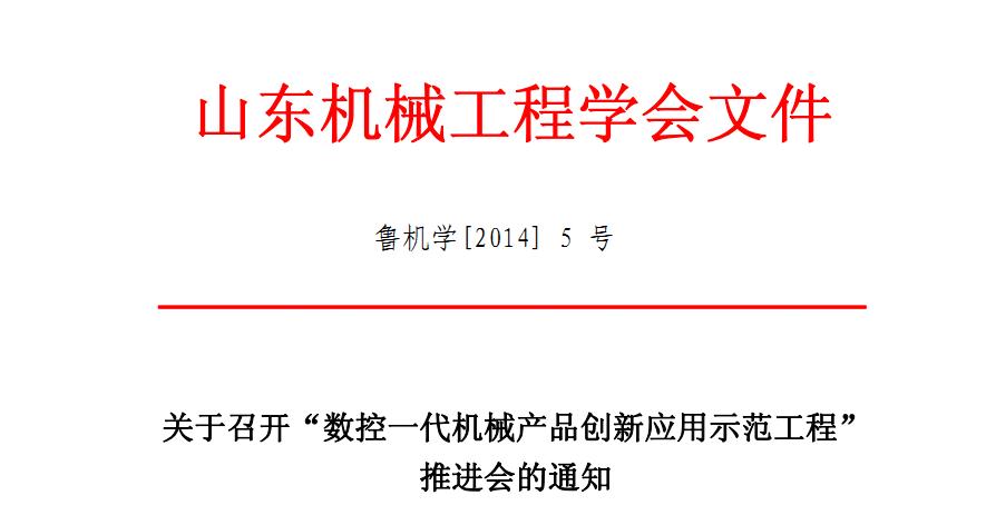 为进一步推进“数控一代机械产品创新应用示范工程” ,提高我国装备制造业的数字化、智能化水平,在各类装备上推广应用数字化控制技术,集成创新一批数控装备,提高机械产品的自主创新能力和产品附加值,推动制造业逐步由“数控一代”向“智能一代”转变,促进工业转型升级,由中国机械工程学会和山东机械工程学会主办、山东机械工程学会和山东机床通用机械工业协会承办的“数控一代机械产品创新应用示范工程”推进会,计划于 2014 年 9 月 20-22 日在山东省泰安市召开。现就会议有关事宜通知如下: