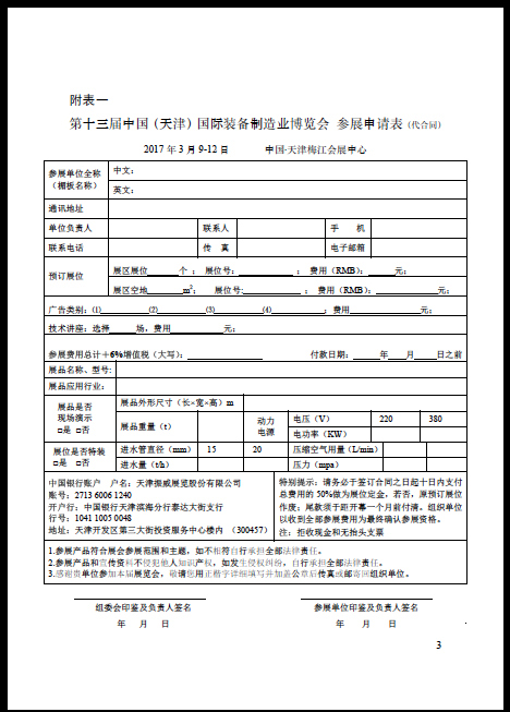 第十三届中国(天津)国际装备制造业博览会 参展申请表(参展人员表)