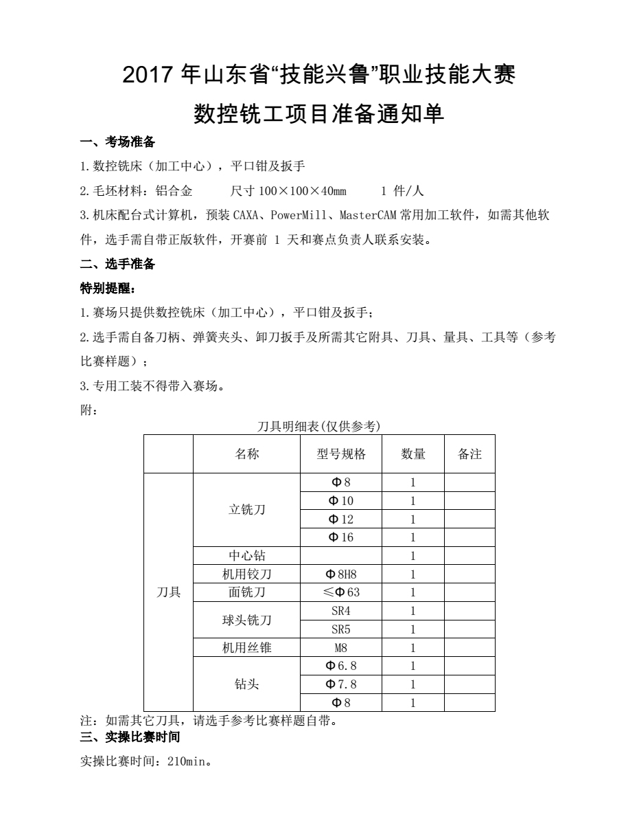 全省数控机床职业技能竞赛数控铣工项目准备通知单及模拟试题