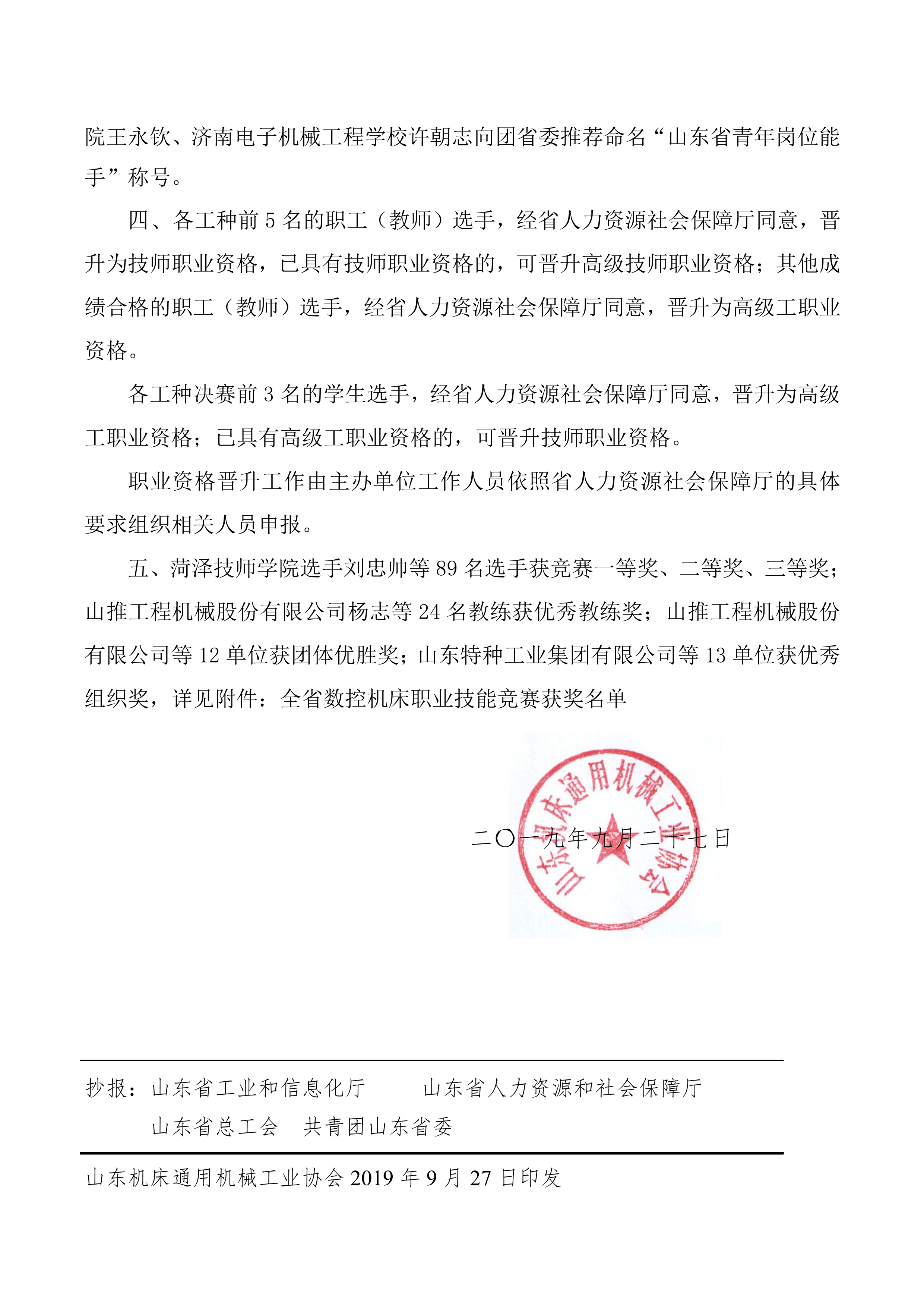 2019年关于公布山东省“技能兴鲁”职业技能大赛 —全省数控机床职业技能竞赛成绩的通知