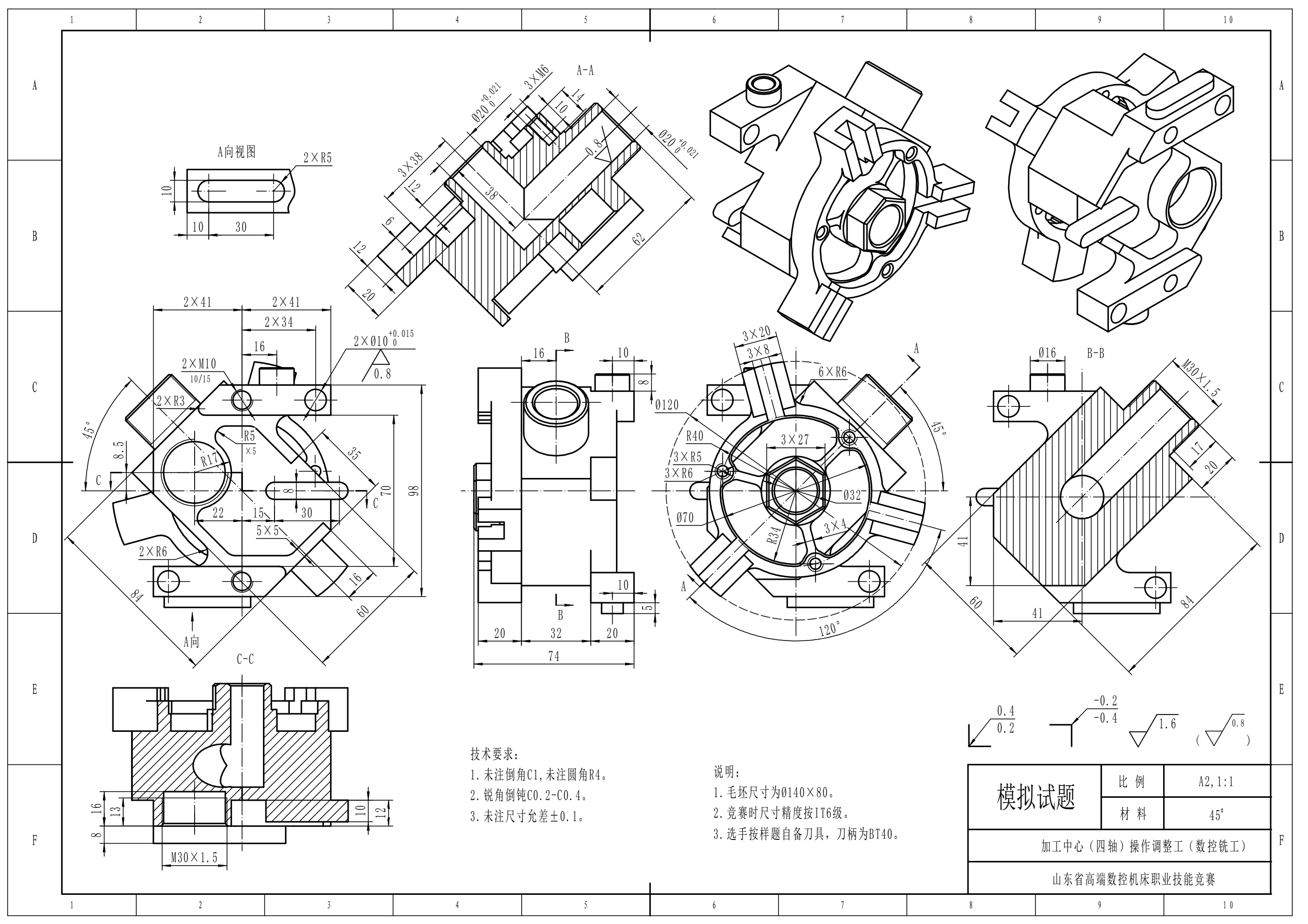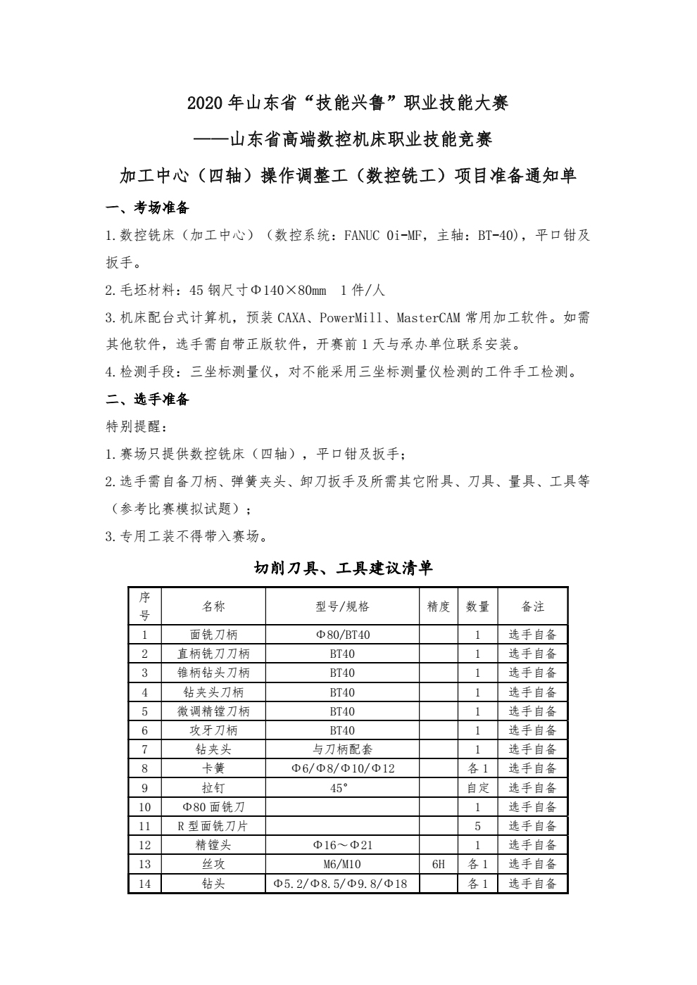 2020年山东省“技能兴鲁”职业技能大赛加工中心(四轴)操作调整工(数控铣工)项目准备通知单及模拟试题