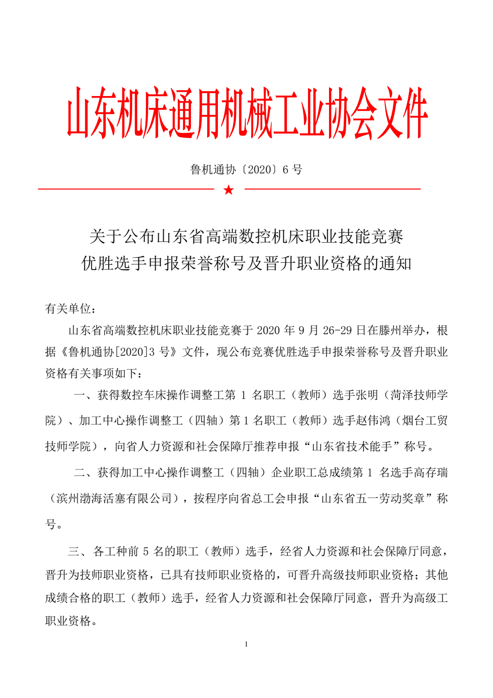 关于公布山东省高端数控机床职业技能竞赛优胜选手申报荣誉称号及晋升职业资格的通知