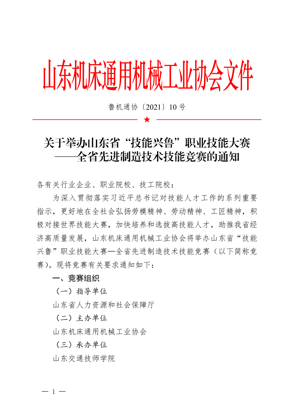 关于举办山东省“技能兴鲁”职业技能大赛—全省先进制造技术技能竞赛的通知