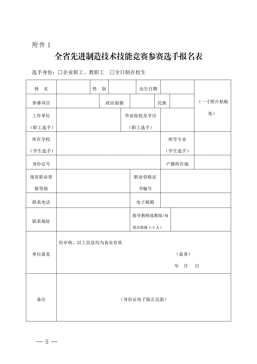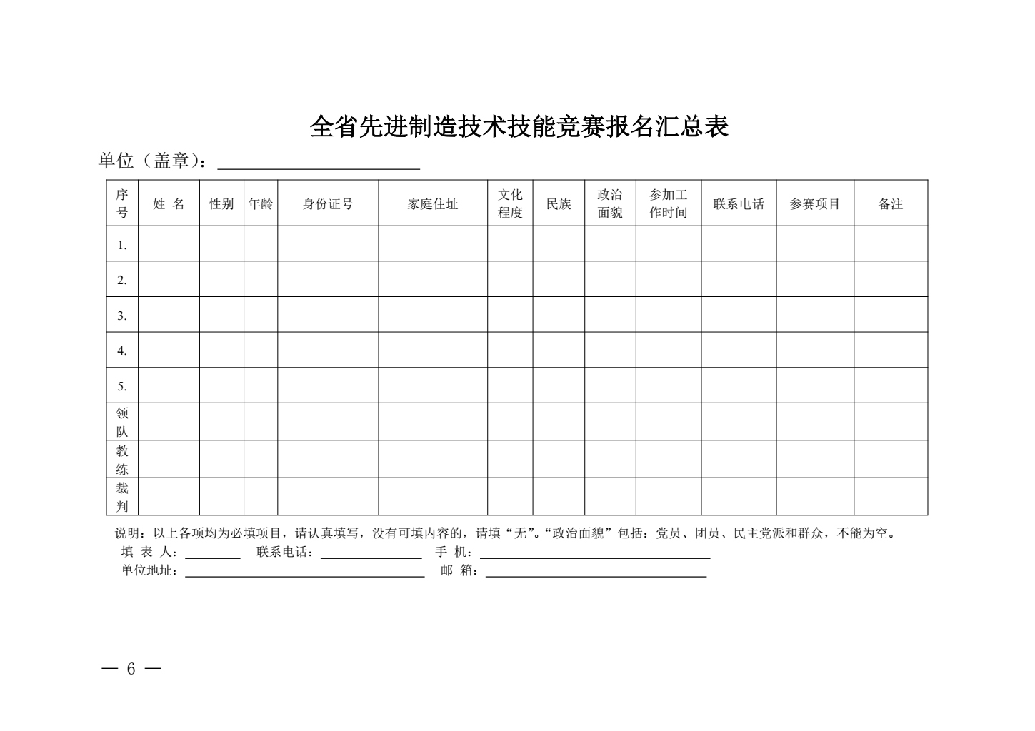 全省先进制造技术技能竞赛报名表
