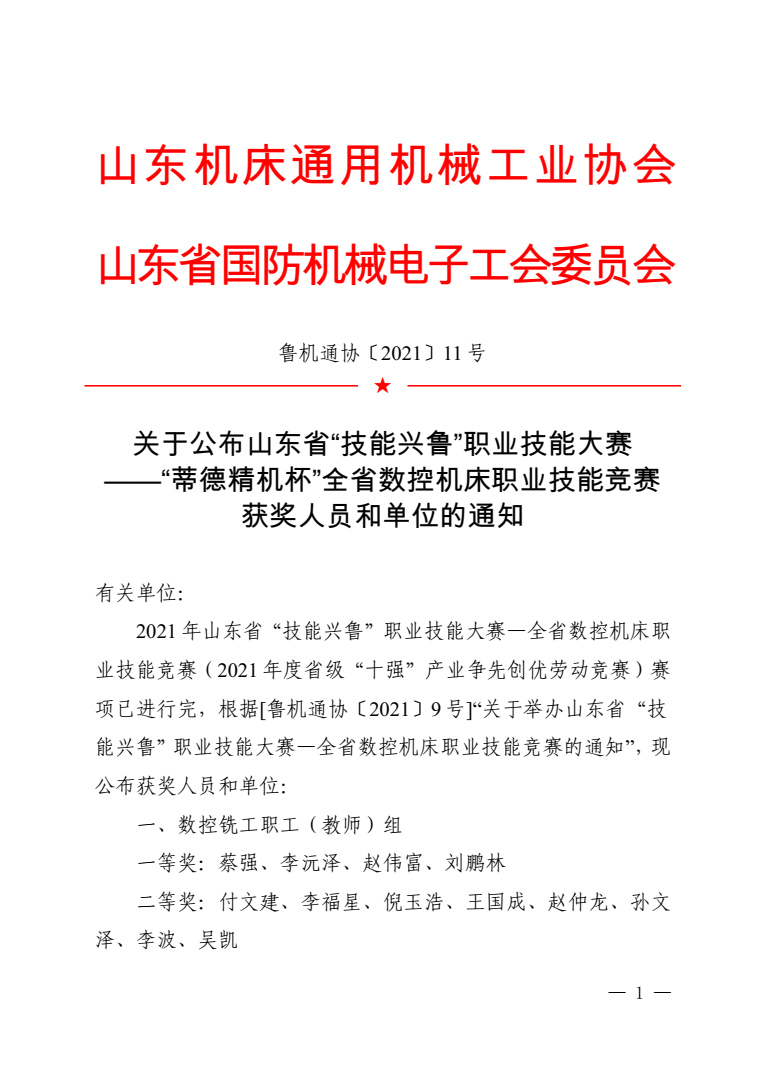 关于公布山东省“技能兴鲁”职业技能大赛—“蒂德精机杯”全省数控机床职业技能竞赛获奖人员和单位的通知.pdf