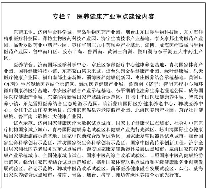 第五节 医养健康产业 深入实施“健康山东”战略,促进医疗、养老、养生、体育等多业态融合发展,打造全方位、全周期健康服务产业链,创建国家医养结合示范省。到2022年,医养健康产业增加值力争达到11500亿元,占地区生产总值的11.5%。 提升医药工业发展水平。加大创新药物研发攻关力度,积极开发新剂型和新产品,重点发展以原料药、化学创新药、化学仿制药和高端制剂为主的化学药,以疫苗与诊断试剂、海洋药物等为主的生物药。围绕家庭和个人医疗、保健、养老需求,发展数字化诊疗设备、健康监测装备、可穿戴医疗装备、医用机器人等新型医疗器械设备。支持医药企业向功能性食品、特殊医学用途配方食品、化妆品以及保健、预防等领域延伸。加强中药材种质资源保护利用,加快推动疗效确切、临床价值高的中药创新药的研发和产业化。加快威海国家医疗器械技术创新中心、国家制造业(高性能医疗器械)创新中心建设,支持青岛、烟台、威海建设海洋生物医药国家创新型产业集群,济南、青岛、潍坊、威海、临沂、枣庄建设国家中医药综合改革试验区。 创新医养健康服务模式。大力发展基于互联网和人工智能的健康服务产业,支持商业应用程序开发,推进远程医疗、移动医疗和医药物流等第三方服务规范发展。提高健康医疗大数据开发利用水平,构建基于大数据的医疗决策支持系统,建设国家健康医疗大数据中心和济南国际医学科学中心。充分发挥山东半岛黄金海岸、鲁中南山区生态资源优势,推动健康医疗与教育、旅游、休闲、养生融合发展,创新中医药健康旅游产品。建设全省科学健身指导体系,倡导“运动处方”模式,开展慢性病运动干预。支持大型医药企业建设第三方检验中心、影像中心、透析中心,实现从提供产品向提供整体解决方案转变。鼓励有条件的医疗机构向养老、康复、养生服务延伸,支持社会力量开办医养结合机构,提供个性化、多层次医养服务产品,开展各类医养结合产业试验区、示范区和试点城市建设。鼓励中医院治未病中心建设,推动传统家政企业拓展健康养老服务新领域。 创新医养健康发展环境。推进公立医院综合改革和分级诊疗制度改革,加强城乡医疗对口支援,加快全科医生培养和符合条件的医生多点执业。建立完善家庭医生签约服务健康制度,支持居家养老服务机构与周边社区卫生服务中心、乡镇卫生院、诊所等基层医疗机构深化合作,将医疗护理和康复等服务延伸至家庭,为特殊和老年群体提供日常护理、保健咨询等服务。