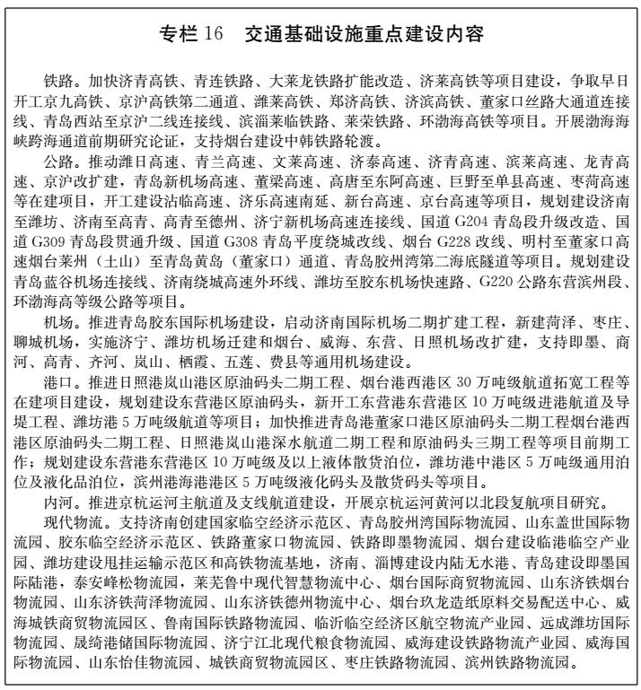 第三节 建设一流基础设施 坚持基础性、先导性、战略性方向,提高智能化、网络化、现代化水平,加快建设技术先进、功能完善、便捷高效、安全坚固的综合基础设施支撑体系。 交通基础设施。积极融入国家综合交通网,畅通省内外运输网络,打造交通强国战略山东示范区。铁路。加快鲁南高铁、济莱临高铁建设,打造“三环四横六纵”的快速铁路网络,建设大莱龙扩能改造、聊泰、淄东等铁路项目,完善“四纵四横”货运铁路网。公路。实施济青、京沪(山东段)、沈海(山东段)等大运量路段改扩建工程,推进普通国省道低标准路段改造,按照一条综合运输通道至少配置一条免费快速干线公路的原则,开展全省干线快速路网工程规划建设,大力推进“四好农村路”建设。轨道交通。推进济南、青岛地铁和轻轨建设,规划建设淄博、烟台、潍坊、济宁、临沂、威海等市轨道交通。机场。加强民用运输机场和通用机场建设,完善机场布局,提高机场资源配置效率,构建现代民用航空体系。港口。以资本为纽带、以市场为导向,整合港口资源,带动航运协同合作及一体化运营,打造现代化港口群。按程序成立省港口发展管理委员会,作为省政府议事协调机构,对港口群进行统一规划,实现港口间合理分工和良性互动。支持各市通过多种方式参与港口运营,打通出海通道。加快港口公用基础设施及大型化、专业化码头建设,推进港口内部优化整合,打造新一代国际智慧港口。实施通江达海内河水运工程,加强内河航道建设,初步形成以京杭运河主航道为骨架,其他支流航道为补充的“一干多支”航运网络和济宁港、枣庄港、泰安港等内河港口群。支持济南优化跨黄河桥隧布局。交通与物流融合发展。发展智慧物流,鼓励有实力的运输企业向多式联运、综合物流服务商转变,推进国际货运班列运行,打通省内外物流大通道,建设综合性物流基地和节点枢纽城市。开展国际中转集拼业务和大宗商品国际中转创新试点,支持有条件的市建设国家物流标准化城市试点和现代物流创新发展城市试点,发挥青岛胶州湾国际物流园等国家示范物流园区的引领带动作用,提高物流信息化、标准化和集约化水平。