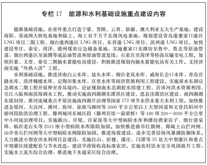 能源基础设施。实施能源保障、能源网络和能源优化工程,构建清洁低碳、安全高效、供应优化的现代能源体系。能源保障。坚持内压外拓,在做好煤炭去产能的基础上,有序推进鲁西煤炭基地保护性开发。稳定开发油气资源,有序推进近海油气田和页岩油开发,加快国家骨干油气管网和沿海LNG接收站规划建设,充分利用省外、境外油气资源。实施煤电提升改造,通过“上大压小”适度发展大型高效、节能环保煤电机组,加快现役机组超低排放和节能环保升级改造。加快新能源和可再生能源发电发展,实施光伏发电示范工程,统筹陆上和海上风电开发,合理布局生物质和垃圾发电项目。能源储输网络。统筹省外能源引进和省内产需衔接,构筑煤炭主要运输网络。对接西气东输、中俄东线等国家骨干输气工程,加强国家原油战略储备基地建设。持续提高电网调峰能力,保障安全稳定运行。能源优化。严格实行能耗强度和总量“双控”制度,努力压减省内煤炭消费总量,逐步降低煤炭消费比重。实施“气化山东”工程,积极推进天然气在工业、交通、发电、供暖等领域高效利用。大幅提高新能源和可再生能源利用规模,推动绿色电力、绿色热力、绿色燃料生产与应用。 水利基础设施。突出水资源的刚性约束,以节水、供水重大工程建设为重点,构筑水安全保障体系。论证规划峡山水利胶东调水水源等工程,建设一批河道拦蓄工程和抗旱应急水源工程。实施金堤河等河道重点河段治理,推进病险水库水闸除险加固,疏浚治理河湖水系,加强沿海7市海堤工程建设,推进黄河口治理,实施地下水超采区综合治理工程。加强大中型灌区续建配套节水改造,加快小型农田水利项目县建设。 信息基础设施。构建完善高速、移动、安全、泛在的新一代信息基础设施,统筹规划政务数据资源和社会数据资源,完善基础信息资源和重要领域信息资源建设,形成万物互联、人机交互、天地一体的网络空间。落实“宽带中国”和“宽带乡村”战略,推进固定宽带网络升级,推进超高速、大容量光传输技术应用,升级骨干传输网,大幅提高城域网和骨干网出口带宽,城市家庭普遍具备每秒1000兆以上接入服务能力,农村家庭普遍具备100兆接入服务能力。推动海底光缆系统开放,支持青岛建设国际通信业务出入口局,建设济南至互联网国际出入口局的互联网国际通信专用通道。加快基于互联网协议IPv4/IPv6技术过渡的骨干网和接入网改造。构建新一代移动通信网络,加快推动4G网络建设,推进5G联合研发、试验和商用试点。加快电信网、广播电视网、互联网三网融合进程。支持公共场所提供免费无线宽带服务。