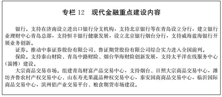 第五节 现代金融服务 把服务实体经济作为金融发展的出发点和落脚点,使更多金融资源高效配置到经济社会发展的重点领域和薄弱环节,全面提升服务效率和水平,构建现代化、普惠化、便利化的金融服务体系。到2022年,现代金融服务业增加值力争达到6000亿元,占地区生产总值的6%。 拓宽直接融资渠道。把发展直接融资放在更加重要的位置,深入推进多层次资本市场体系建设。大力推动规模企业开展规范化公司制改制,支持符合条件的企业到沪深交易所、全国股转系统及境外资本市场上市挂牌。鼓励农村产权、海洋产权、能源环境、文化产权等交易场所建设,拓宽覆盖范围和交易品种。积极推动市场化、法治化债转股,鼓励和引导企业利用可转债、双创债等债务融资工具创新产品,支持企业赴境外发行人民币和外币债券。探索互联网私募股权融资平台建设路径。推动提升国有资产、基础设施、金融资产、企业资产等证券化率水平,将实体经济优势转化为资本竞争优势。 做优金融支柱产业。发挥信贷融资重要渠道作用,保持信贷增速与经济增长合理匹配。推动银行业加快转变发展方式,招引一批内外资银行机构区域总部及业务总部,鼓励农商行、城商行、民营银行发展特色信贷业务。积极开拓农业保险、信用保证保险、商业健康养老保险等险种,推进知识产权保险等险种试点。推动保险投资从债权投资为主,向股权投资、股债结合等方式拓展。 推动金融业务创新。加快完善金融市场、金融组织、金融产品和服务模式,更好满足实体经济和人民群众多样化的金融需求。鼓励利用互联网、大数据、人工智能等,进行金融业务流程改造和产品创新。积极发展养老金融、教育金融、文化金融、旅游金融、农村金融等新型金融服务。规范发展互联网金融、区块链、人工智能等领域的新型金融业态。支持小额贷款公司、典当、融资租赁、商业保理等金融组织创新、可持续发展。统筹发展介于现货与期货之间的大宗商品交易业务,打造具有全国影响力的交易场所。支持济南推进新旧动能转换金融创新发展试点,开展金融服务实体经济改革创新。支持烟台开展基金管理服务专项改革创新,青岛建设财富管理金融综合改革试验区。支持枣庄、临沂等市开展普惠金融改革创新,探索完善区域普惠金融服务体系。支持潍坊建设文化艺术金融综合试验区、德州举办京津冀鲁资本技术交易大会。 防范化解金融风险。筑牢市场准入、早期干预和处置退出防线,积极稳妥推进去杠杆,探索建立地方性金融风险处置基金,完善地方风险救助体系。坚决打击非法集资、金融诈骗等金融违法犯罪活动,加大对失信惩戒和恶意逃废金融债权打击力度。完善金融监管机构与地方政府沟通协调机制,健全事中事后监管制度,提升跨行业、跨市场交叉性金融业务监管能力。