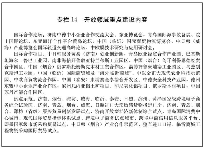 第三节 开放助力动能转换 实施新一轮全方位、高水平对外开放,加快完善法治化、国际化、便利化的开放环境,重塑开放型经济新优势,形成全面开放新格局。 深度融入“一带一路”建设。支持各市发挥特色优势,与沿线国家和地区城市,在港口建设、海洋经济、能源资源、商贸物流、金融服务、人文交流、生态环保等领域加强合作。依托新亚欧大陆桥、中蒙俄等国际经济合作走廊布局建设境外经贸合作园区和重点项目,带动优势产能、优质装备和先进适用技术输出。加强与境外高新技术和先进制造业企业合作,支持在境外设立研发中心。稳妥参与境外油气、矿产等能源资源勘探和开发,提高配置全球资源的能力。设立全省“一带一路”投资基金。发挥济南中欧班列的龙头带动作用,优化提升中欧、中亚班列运输效能。 构建开放型经济新体制。充分借鉴自由贸易试验区改革试点经验,在济南、青岛、烟台市,依托国家级新区、国家级经济技术开发区、国家级高新技术开发区、海关特殊监管区,以及济南新旧动能转换先行区,加快体制机制创新。支持青岛积极创造条件,探索建设自由贸易港。支持济南开展构建开放型经济新体制综合试点。推动济宁、日照、淄博、青岛空港、即墨等综合保税区尽早获批,支持其他符合条件的市申建海关特殊监管区域,推进现有海关特殊监管区域延伸服务功能。推进威海中韩自贸区地方经济合作示范区、中韩(烟台)产业园建设。全面实行准入前国民待遇加负面清单管理制度,加强外商投资企业事中事后监管,探索“无感知”和“低感知”监管方式。推行“服务大使”制度,加强重点外资企业点对点直通包办服务。扩大服务业对外开放,根据国家部署,有序放开育幼养老、建筑设计、会计审计、商贸物流、电子商务等服务业领域准入限制。开展跨境电子商务人民币结算、跨境资产转让政策创新和融资租赁试点。 加快转变外贸发展方式。以技术、标准、品牌、服务为核心,推动货物贸易和服务贸易协调发展,实现优质优价、优进优出。鼓励高新技术、高端装备、品牌产品出口,建设外贸转型升级示范基地、贸易平台、国际营销网络。大力发展服务外包,扩大金融、文化、旅游、建筑、软件、研发设计、中医等服务出口。培育外贸新业态、新模式,完善监管制度、服务体系和政策框架,支持跨境电子商务、市场采购贸易、外贸综合服务、国际中转集拼、保税展示交易等健康发展。加快建设电子口岸,推广国际贸易单一窗口、一站式作业、一体化通关。支持济南创建国家级跨境电商试点城市、烟台创建国家服务外包示范城市,临沂创建国家内外贸融合发展试验区,威海创建国家级进口贸易促进创新示范区和全国重要消费品集散区。实施更加积极的进口政策,扩大先进技术设备、关键零部件和优质消费品等进口,促进进出口平衡发展。支持青岛汽车整车进口口岸开展汽车平行进口试点。 创新区域开放合作模式。加快融入京津冀协同发展国家战略,主动承接北京非首都功能疏解及京津产业转移,积极服务雄安新区建设,支持黄河三角洲地区发展“飞地经济”。加强环渤海地区合作,密切与长三角、珠三角、东北等地区经济联系,构建地区间协作发展机制。