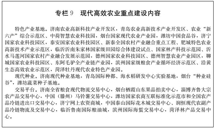 第二节 现代高效农业 坚持农业农村优先发展,深入推进农业供给侧结构性改革,巩固提升山东农业优势,加快构建现代农业产业体系、生产体系、经营体系,积极探索产出高效、产品安全、资源节约、环境友好的路径模式,引领全国农业农村现代化发展。到2022年,现代高效农业增加值力争达到1200亿元,占地区生产总值的1.2%。 加快发展农业“新六产”。调整优化农业产品、产业和布局结构,着力开发农业多种功能,促进农林牧渔业与加工、流通、旅游、文化、康养等产业深度融合,推动产业链相加、价值链相乘、供应链相通“三链重构”。利用现代信息技术大力发展智慧农业、农村电商等新产业新业态。加快培育终端型、体验型、循环型农业,构建农产品从田头到餐桌、从初级产品到终端消费无缝对接,集生产生活生态功能于一体的产业新体系。推进农业“新六产”示范县建设,形成全环节提升、全链条增值、全产业融合的农业“新六产”发展格局。 大力发展特色高效农业。把增加绿色优质农产品摆在突出位置,推进农业标准化生产、全程化监管,全面提升农产品质量安全水平。支持潍坊建设国家蔬菜标准中心。实施农业科技创新工程和渤海粮仓科技示范工程,加强现代种业、畜牧良种培育。综合应用工程装备技术、生物技术、信息技术、环境技术,加快发展设施农业。落实藏粮于地战略,划定和建设粮食生产功能区和重要农产品生产保护区,开展耕地轮作休耕试点,推进高标准农田建设,稳定提升粮食产能。积极开展农业科技国际合作。高水平建设黄河三角洲农业高新技术产业示范区、潍坊国家农业开放发展综合试验区、枣庄国家农业可持续发展试验示范区。 提升农业经营服务水平。积极培育家庭农场、合作社、龙头企业等新型经营主体,实现标准化生产、规范化管理、品牌化营销。推进土地入股、土地流转、土地托管、联耕联种等多种经营方式,提升农业适度规模经营水平。发展多元化农业生产性服务,完善农资购买、机种机收、统防统治、烘干仓储等社会化服务体系。推进基层农技推广体系改革,探索建立公益性农技推广与经营性技术服务共同发展的新机制。提升农业装备制造和应用水平,大力推进农业生产经营机械化、信息化,增强农业综合生产能力。建立政府主导、部门协作、统筹安排、产业带动的新型职业农民和农民工培训机制。