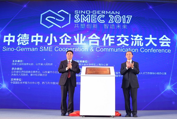 工业和信息化部党组成员、总工程师张峰、山东省副省长王书坚、出席大会,共同为中德(济南)中小企业合作区揭牌。山东省经信委王信副主任、山东省中小企业局王兆春局长等出席大会开幕式。德中经济联合会理事林武福、欧洲专利局原副局长雅克米歇尔等近百位外国嘉宾莅临开幕式。济南市委副书记、市长王忠林出席开幕式并致辞。