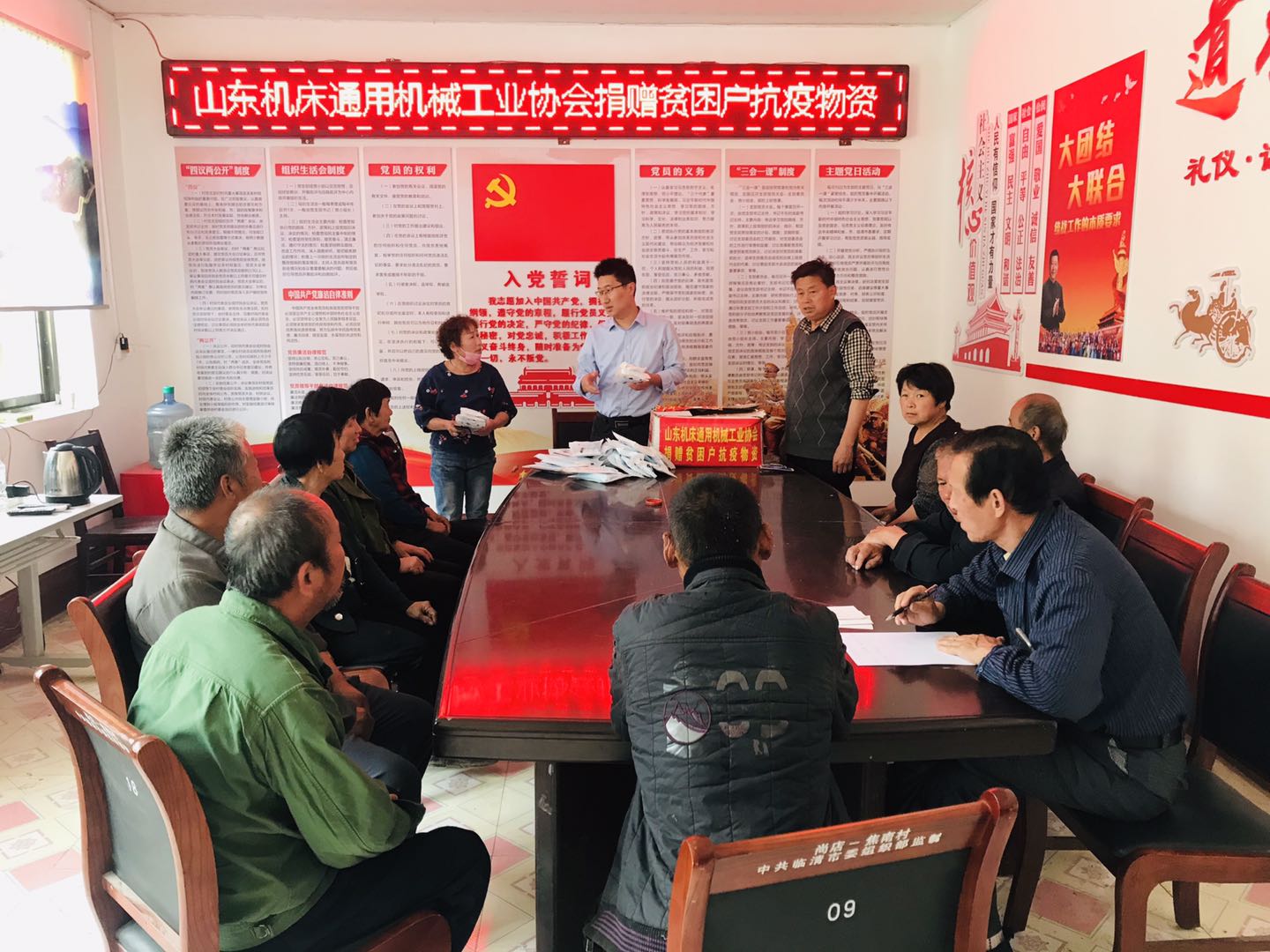 疫情爆发后协会积极联系省派驻村第一书记了解当地在疫情期间贫困户遇到的困难问题,在得知当地贫困户缺少防疫物品后,协会第一时间联系具有资质医疗用品销售资质的单位,并于4月27日完成“一次性医用口罩”的购置; 4月29日聊城市阳光社工服务中心社工助力省派驻村第一书记在临清市尚店镇焦南村开展“战疫扶贫共克时艰”活动; 5月7日,山东机床通用机械工业协会将 购买到的“一次性医用口罩”运送到临清市尚店镇焦南村,为贫困户人员疫情期间的疫情防护尽一份自己的力量。